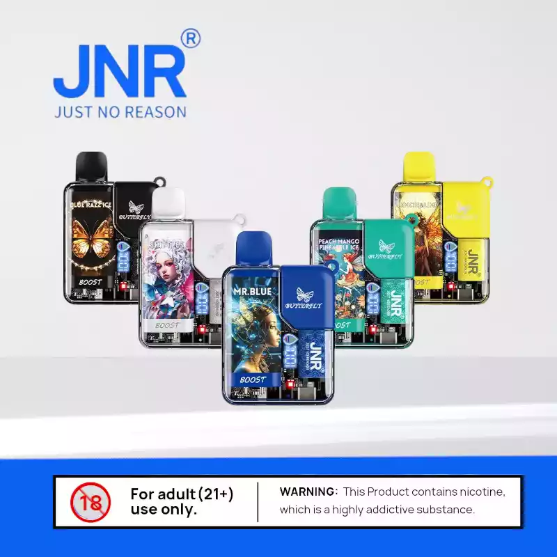 Experience up to 8500 puffs with the JNR Butterfly 8500 Puff. Enjoy 15ml e-liquid, a 750mAh rechargeable battery, Boost Mode, and 20+ exciting flavors. Perfect for lasting enjoyment on the go!