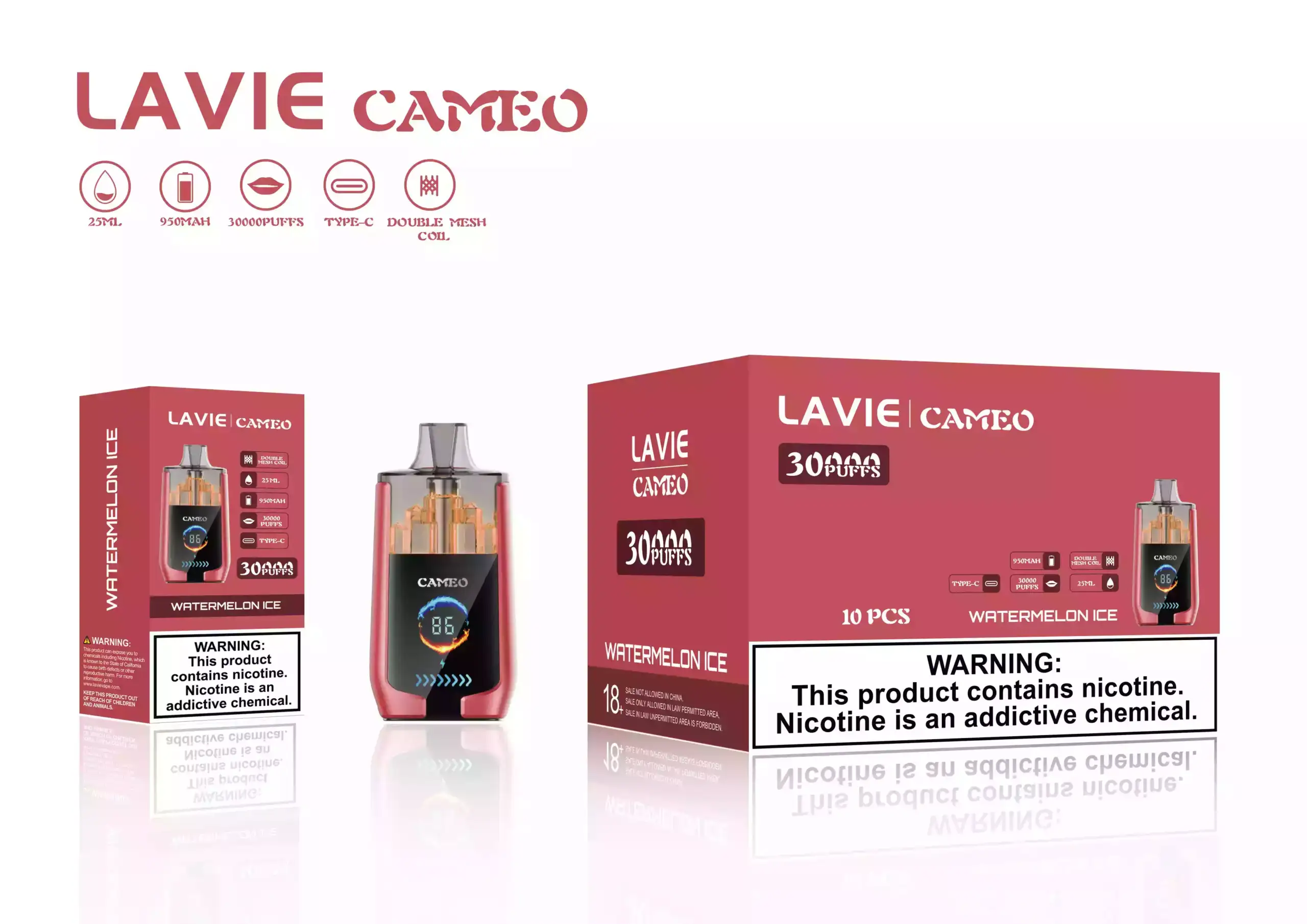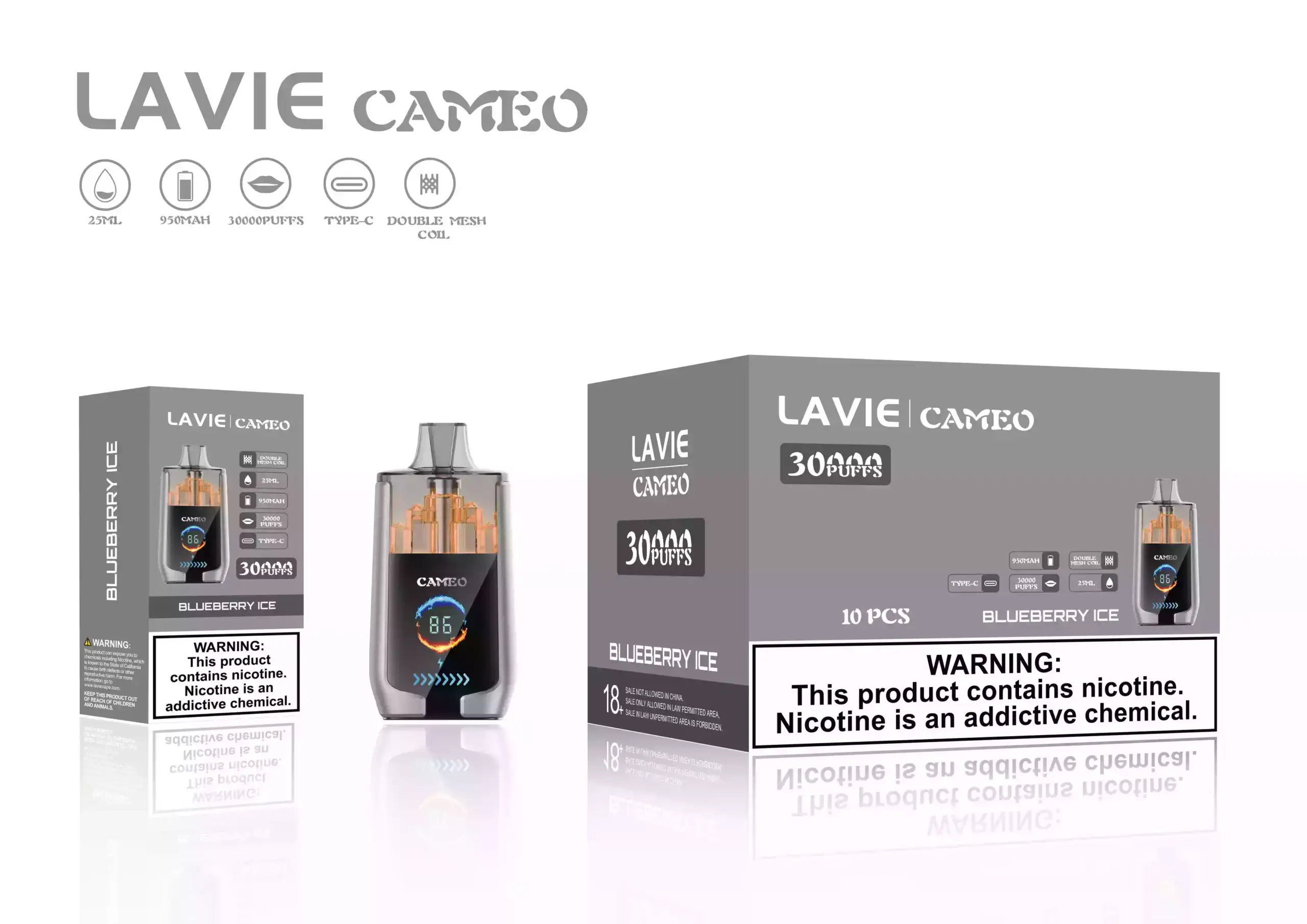 Erleben Sie das ultimative Vaping-Erlebnis mit der Lavie Cameo 30.000 Puffs. Diese Einweg E-Zigarette kombiniert leistungsstarke 950mAh Batterie, großzügige 25ml E-Liquid-Kapazität und Dual Mesh Coil Technologie für intensiven Geschmack und dichten Dampf. Mit dem MI Head Trigger genießen Sie ein intuitives Zuggefühl, während der Type-C Ladeanschluss schnelle und einfache Aufladung garantiert. Ideal für langanhaltendes Vaping, unterwegs oder zu Hause.